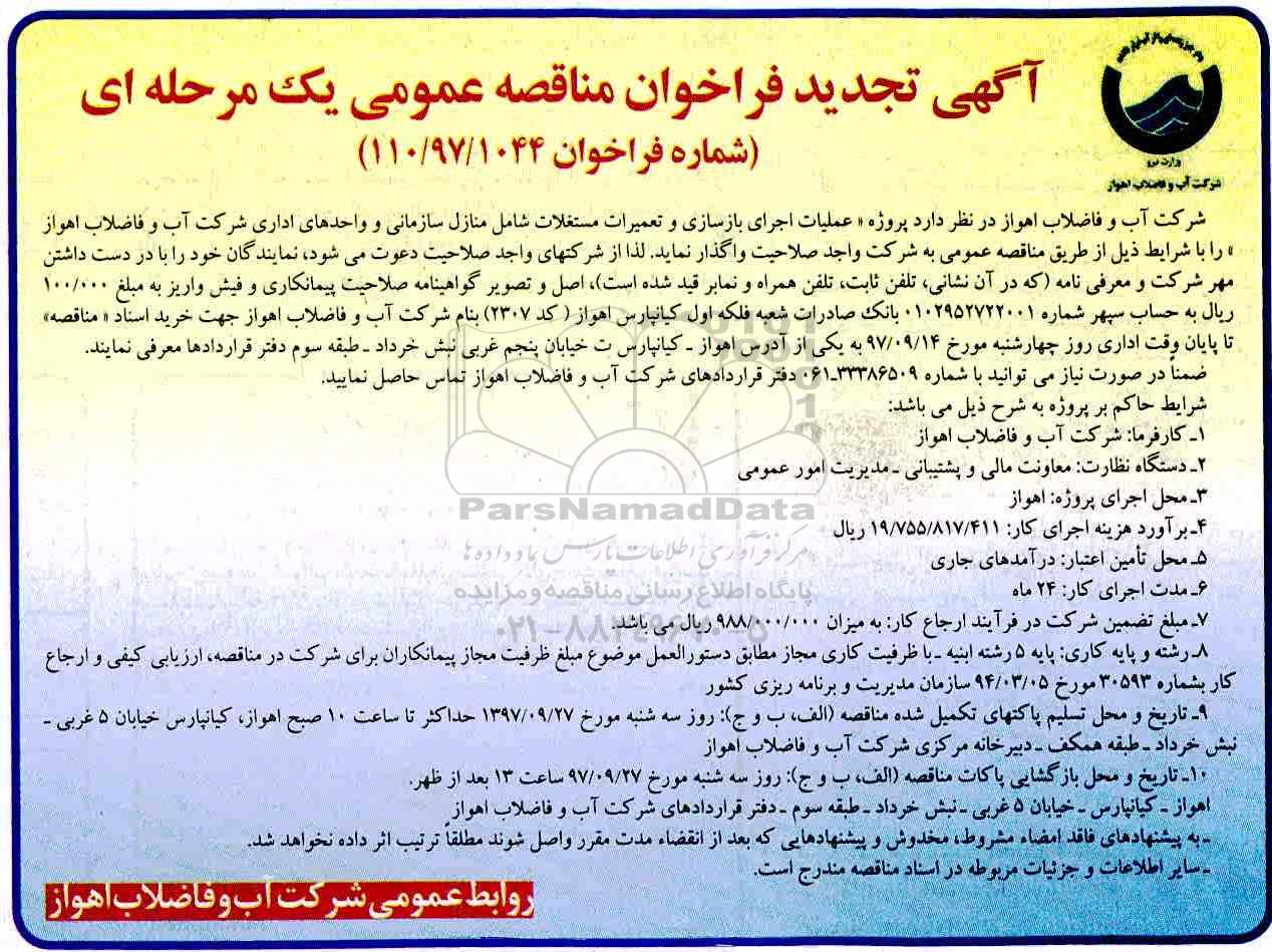 شرکت آب و فاضلاب اهواز در نظر دارد پروژه عملیات بازسازی و تعمیرات مستغلات شامل منازل سازمانی و واحدهای اداری شرکت آب و فاضلاب اهواز را با شرایط ذیل از طریق مناقصه عمومی به شرکت واجد صلاحیت واگذار نماید. لذا از شرکتهای واجد صلاحیت دعوت می شود نمایندگان خود را با در دست داشتن مهر شرکت و معرفی نامه که در آن نشانی ، تلفن ثابت ، تلفن همراه و نمابر قید شده است اصل و تصویر گواهینامه صلاحیت پیمانکاری و فیش واریز وجه به مبلغ 100.000 ریال به حساب جاری شماره 0102952722001 بانک صادرات شعبه فلکه اول کیانپارس اهواز (کد 2307) بنام شرکت آب و فاضلاب اهواز جهت خرید اسناد مناقصه تا پایان وقت اداری روز 4شنبه مورخ 97.09.14 به آدرس اهواز کیانپارس ت خیابان پنجم غربی نبش خرداد- طبقه سوم دفتر قراردادها معرفی نمایند.