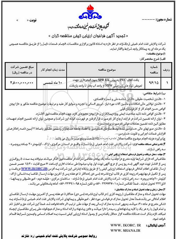 شرکت پالایش نفت امام خمینی (ره) شازند در نظر دارد به استناد قانون برگزاری مناقصات، انجام خدمات ذیل را از طریق مناقصه عمومی یک مرحله ای به پیمانکار واجد شرایط واگذار نماید.