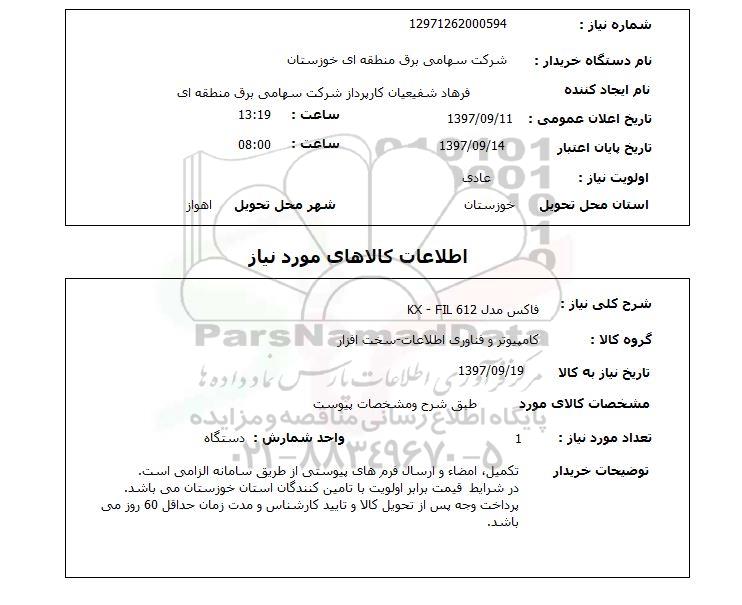 شرح کلی نیاز: فاکس مدل KX-FIL 612