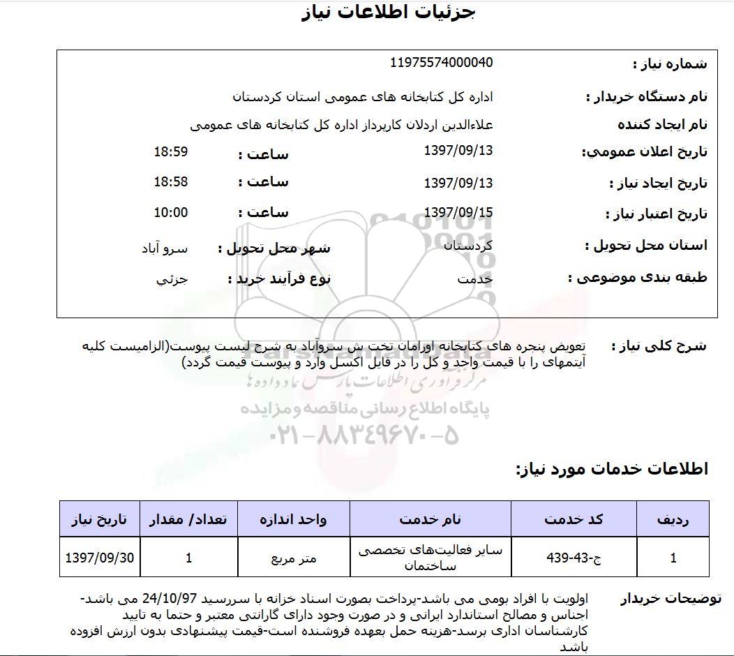 کلی نیاز: تعویض پنجره های کتابخانه اورامان تخت ش سروآباد به شرح لیست پیوست (الزامیست کلیه آیتمهای را با قیمت واحد و کل را در فایل اکسل وارد و پیوست قیمت گردد)