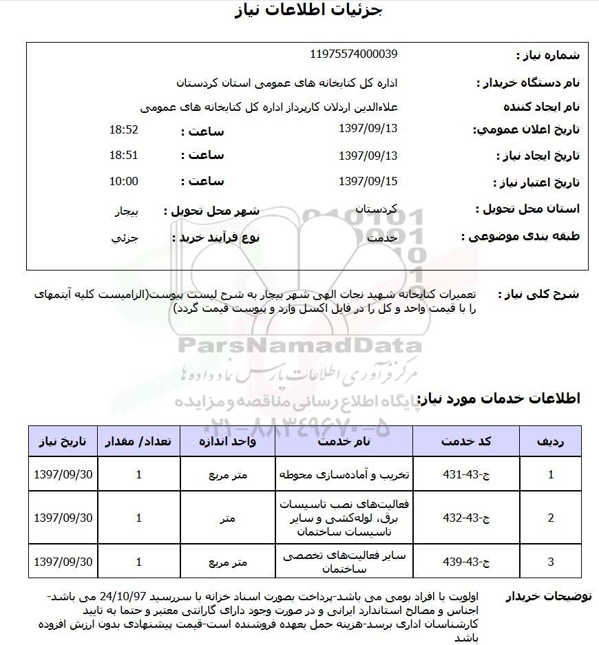 شرح کلی نیاز     تعمیرات کتابخانه شهید نجات الهی شهر بیجار به شرح لیست پیوست  الزامیست کلیه آیتمهای را با قیمت واحد و کل را در فایل اکسل وارد و پیوست قیمت گردد