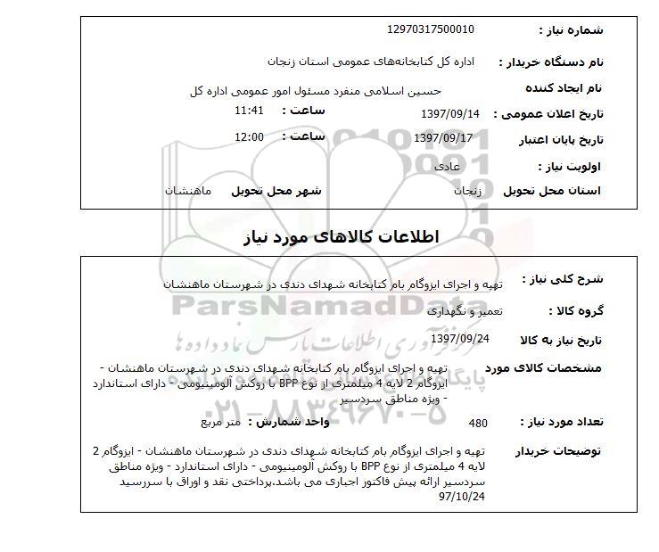 شرح کلی نیاز: تهیه و اجرای ایزوگام بام کتابخانه شهدای دندی در شهرستان ماهنشان