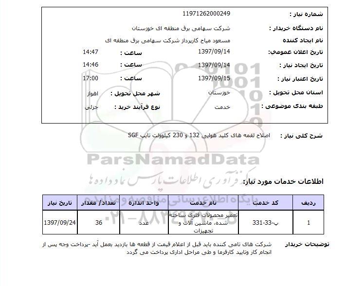 شرح کلی نیاز: اصلاح لقمه های کلید هوایی 132 و 230 کیلو ولت تایپ SGF