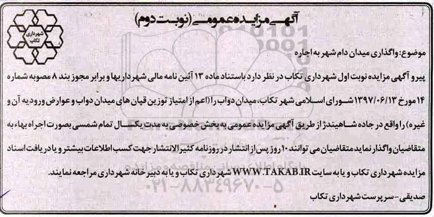 پیرو آگهی مزایده نوبت اول شهرداری تکاب در نظر دارد باستناد ماده 13 آئین نامه مالی شهرداریها و برابر مجوز بند 8 مصوبه شماره 14 مورخ 97.6.13 شورای اسلامی شهر تکاب میدان دواب را اعم از امتیاز توزین قپان های میدان دواب و عوارض ورودیه آن و غیره را واقع در جاده شاهیندژ از طریق آگهی مزایده عمومی به بخش خصوصی به مدت یکسال تمام شمسی بصورت اجاره بها به متقاضیان واگذار نماید