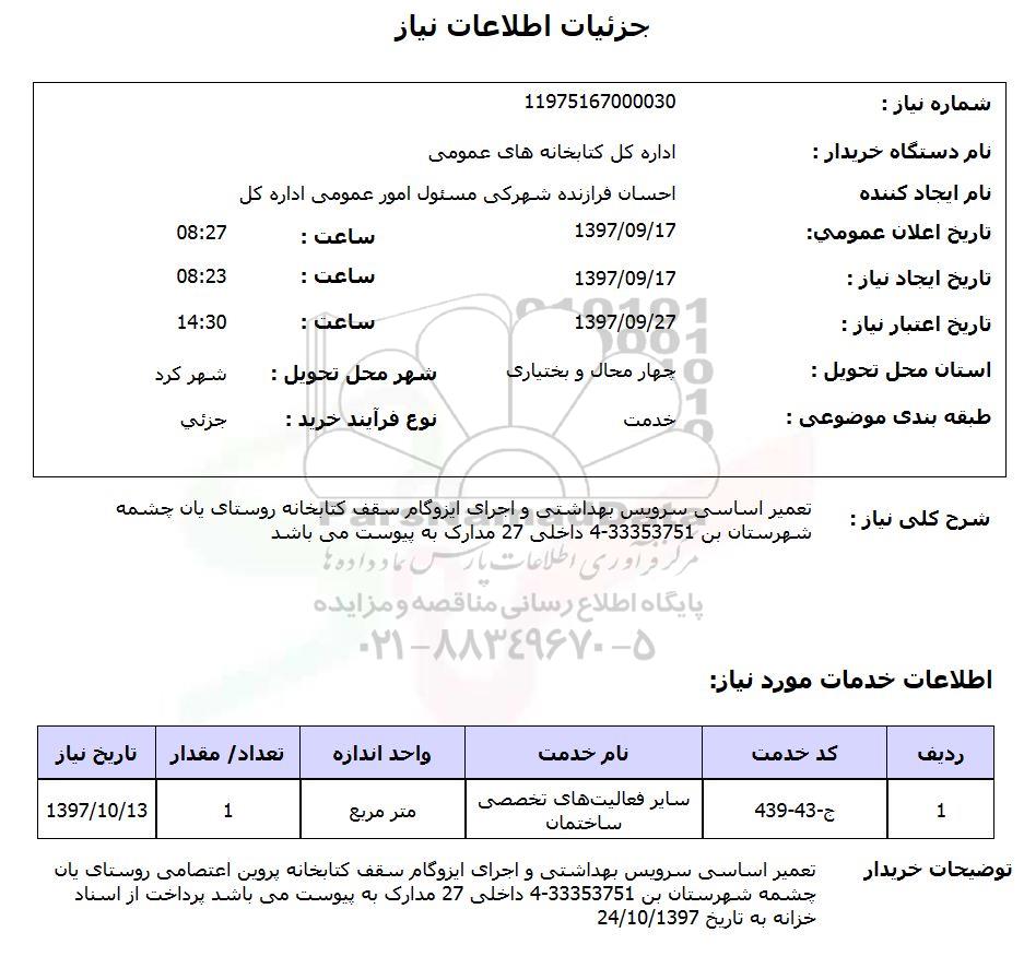 شرح کلی نیاز: تعمیر اساسی سرویس بهداشتی و اجرای ایزوگام سقف کتابخانه روستای یان چشمه شهرستان بن 33353751-4 داخلی 27 مدارک به پیوست می باشد
