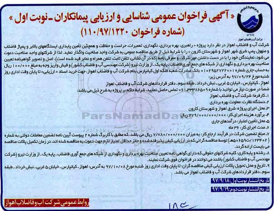 فراخوان راهبری، بهره برداری، نگهداری، تعمیرات، حراست و حفاظت, آگهی فراخوان عمومی شناسایی و ارزیابی پیمانکاران,فراخوان راهبری، بهره برداری، نگهداری، تعمیرات، حراست و حفاظت
