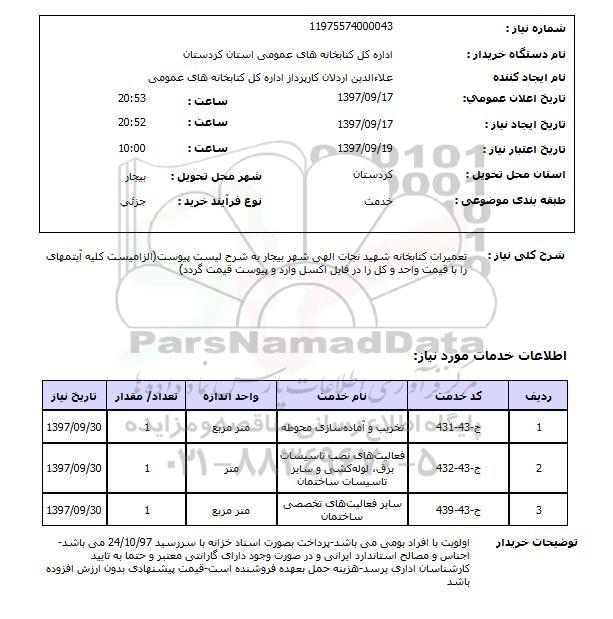 شرح کلی نیاز تعمیرات کتابخانه شهید نجات الهی شهر بیجار به شرح لیست پیوست الزامیست کلیه آیتمهای را با قیمت واحد و کل را در فایل اکسل وارد و پیوست قیمت گردد.