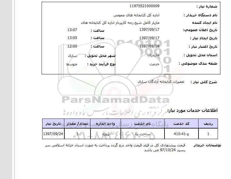 شرح کلی نیاز: تعمیرات کتابخانه آزادگان ساری