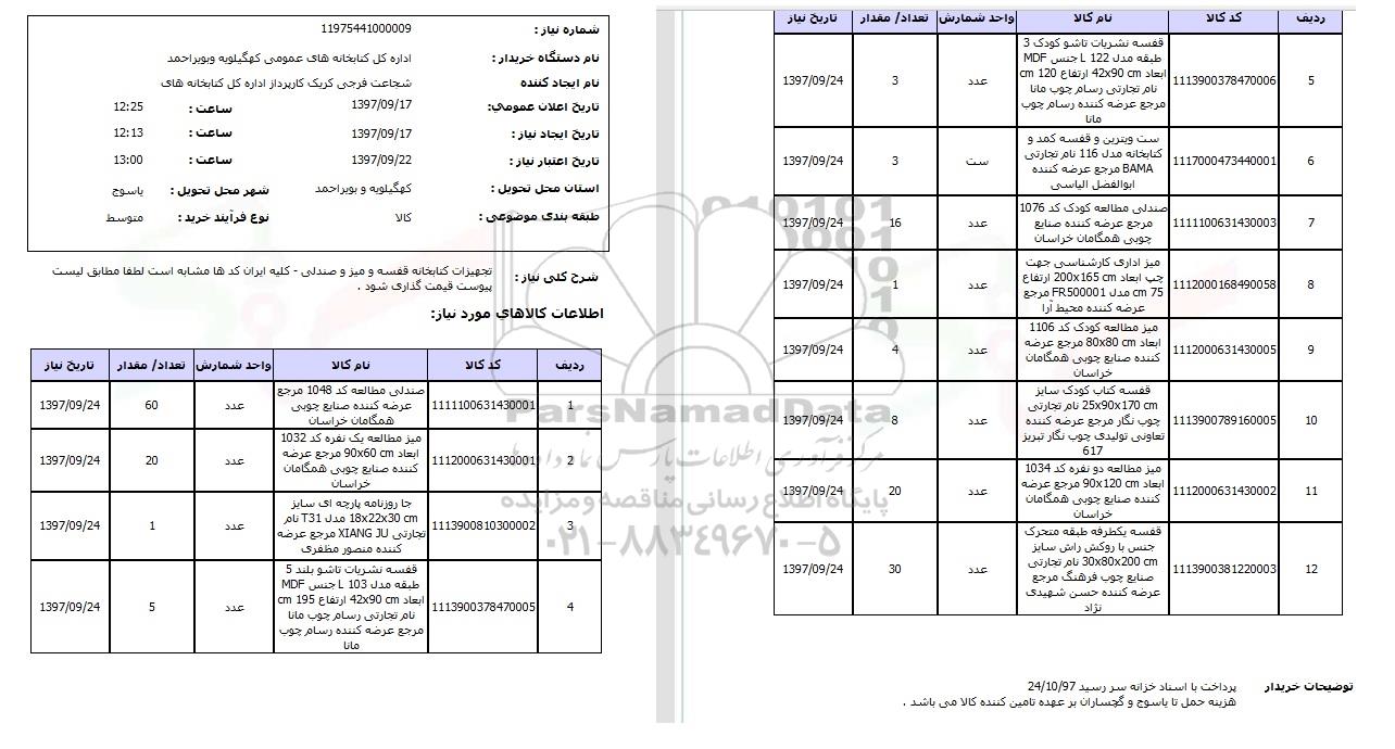 شرح کلی نیاز : تجهیزات کتابخانه قفسه و میز و صندلی - کلیه ایران کدها مشابه است لطفا مطابق لیست پیوست قیمت گذاری شود