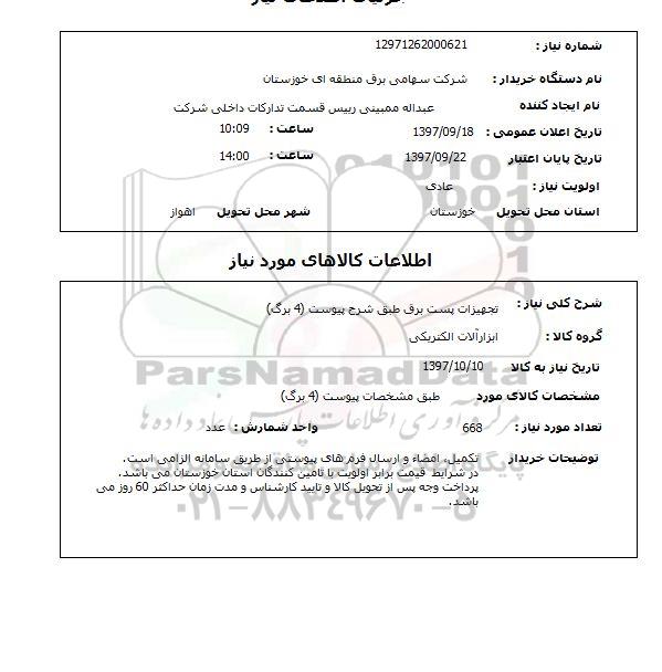 شرح کلی نیاز: تجهیزات پست برق طبق شرح پیوست (4 برگ)