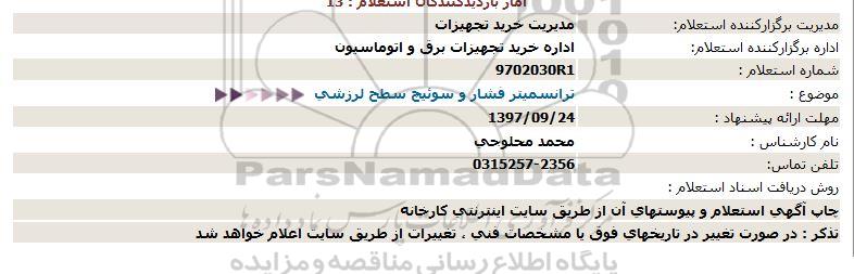 استعلام ترانسمیتر فشار و سوئیچ سطح لرزشی, استعلام , استعلام ترانسمیتر فشار و سوئیچ سطح لرزشی