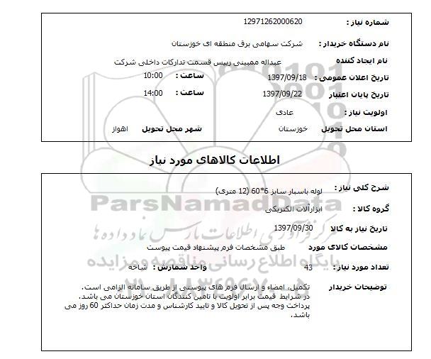 شرح کلی نیاز: استعلام لوله باسبار سایز 6*60 (12متری)