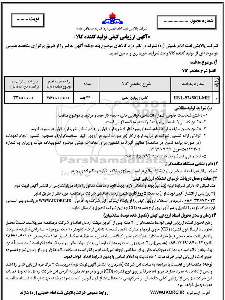 شرکت پالایش نفت امام خمینی ره شازند در نظر دارد کالای موضوع بند یک آگهی حاضر را از طریق برگزاری مناقصه عمومی دو مرحله ای از تامین کننده / تولید کننده کالا واجد شرایط خریداری و تامین نماید