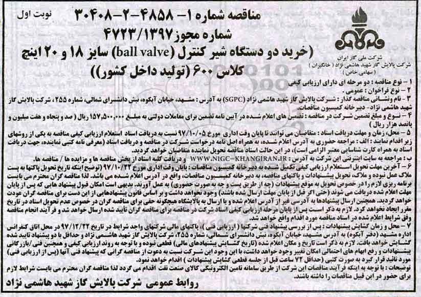 مناقصه خرید دو دستگاه شیر کنترل از کلیه افراد متخصص و شرکتها واجد شرایط دعوت به عمل میآید در مناقصه با کد خبرگزاری پارس نماد: 1413897 شرکت نمایند.