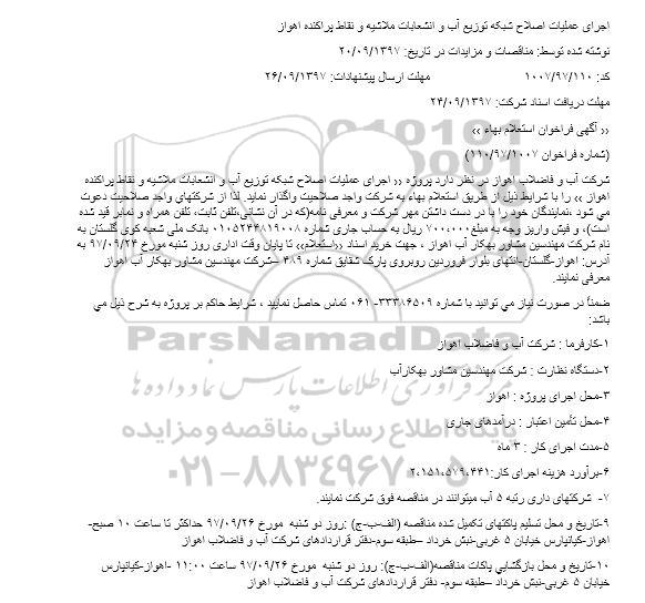 شركت آب و فاضلاب اهواز در نظر دارد پروژه اجرای عملیات اصلاح شبکه توزیع آب و انشعابات ملاشیه و نقاط پراکنده اهواز ›› را با شرایط ذیل از طریق استعلام بهاء به شركت واجد صلاحیت واگذار نماید. لذا از شركتهای واجد صلاحیت دعوت می شود ،نمایندگان خود را با در دست داشتن مهر شرکت و معرفی نامه(که در آن نشانی،تلفن ثابت، تلفن همراه و نمابر قید شده است)، و فیش واریز وجه به مبلغ۷۰۰،۰۰۰ ریال به حساب جاری شماره ۰۱۰۵۲۴۴۸۱۹۰۰۸ بانک ملی شعبه کوی گلستان به نام شرکت مهندسین مشاور بهکار آب اهواز ، جهت خرید اسناد ‹‹استعلام›› تا پایان وقت اداری روز شنبه مورخ 97.9.24 به آدرس: اهواز-گلستان-انتهای بلوار فروردین روبروی پارک شقایق شماره ۴۸۹ –شرکت مهندسین مشاور بهکار آب اهواز معرفی نمایند.