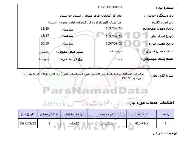 شرح کلی نیاز تعمیرات کتابخانه شهید مطهری رامشیر طبق مشخصات فنی پرداختی اوراق خزانه بند ز با سررسید دی 97