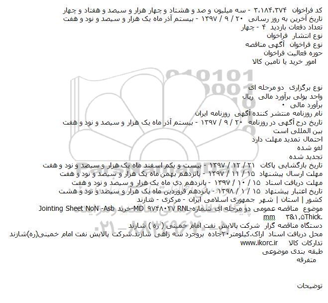 موضوع مناقصه عمومی دو مرحله ای شماره RNL-۹۷۴۸۰۲۷-MD خریدJointing Sheet NoN -Asb Thick.۱.۵&۳mm