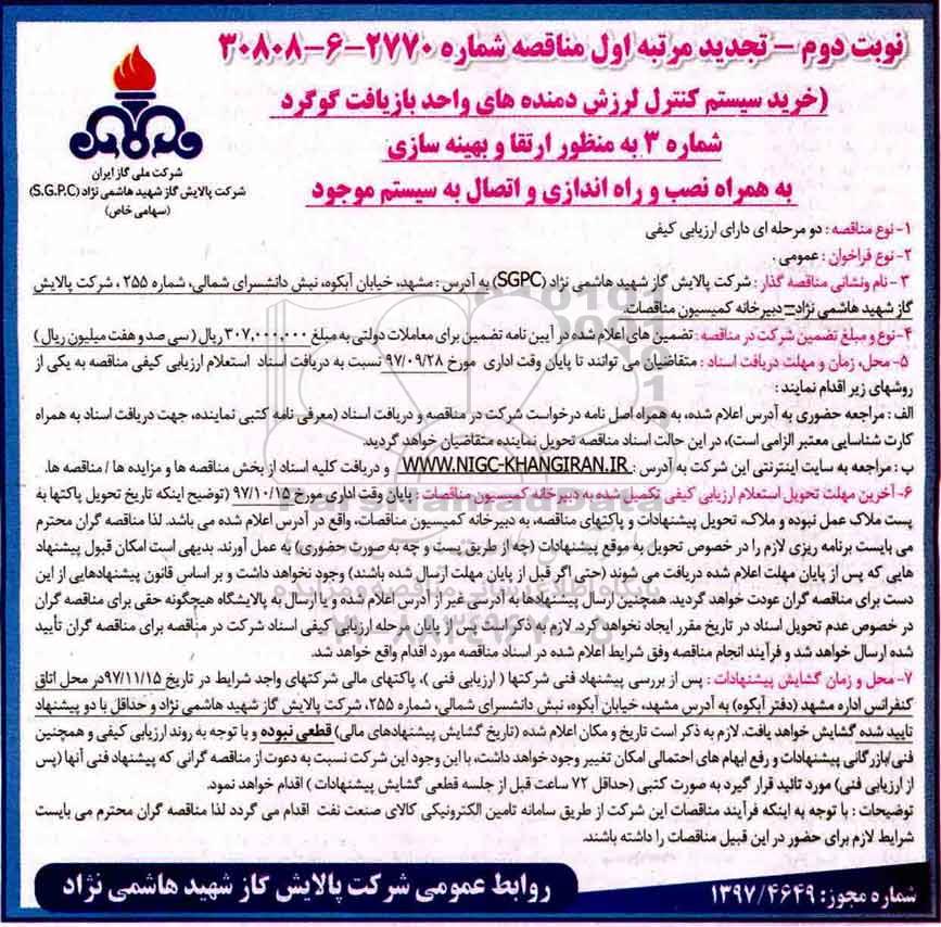 نام و نشانی مناقصه گذار: شرکت پالایش گاز شهید هاشمی نژاد SGPC به آدرس مشهد خیابان آبکوه نبش دانشسرای شمالی شماره 255 شرکت پالایش گاز شهید هاشمی نژاد دبیرخانه کمیسیون مناقصات