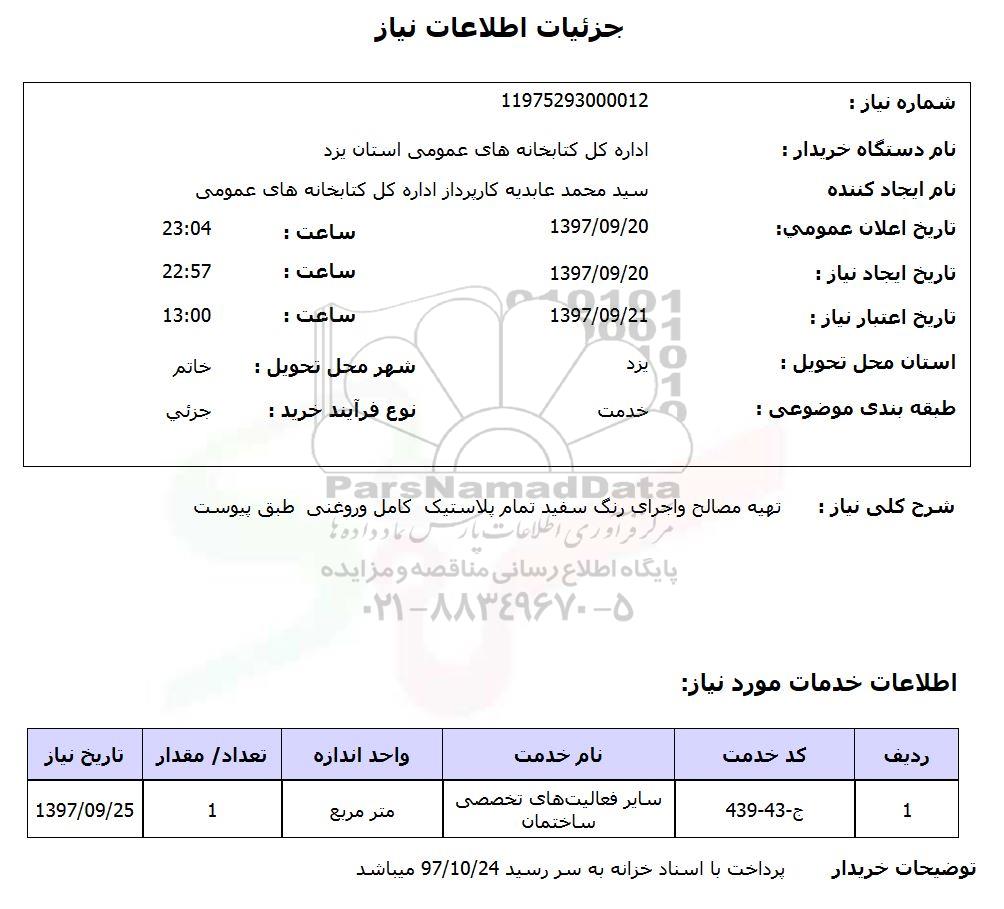 شرح کلی نیاز: تهیه مصالح و اجرای رنگ سفید تمام پلاستیک کامل و روغنی طبق پیوست