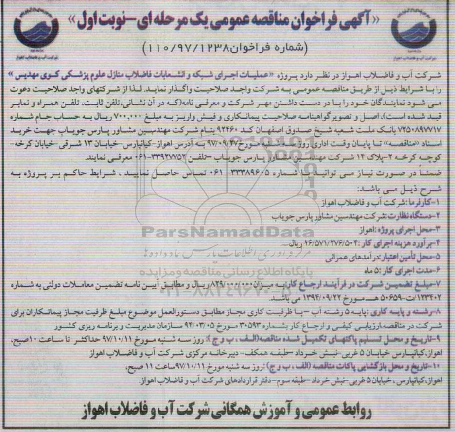 شرکت آب و فاضلاب اهواز در نظر دارد پروژه عملیات اجرای شبکه و انشعابات فاضلاب منازل علوم پزشکی کوی مهدیس را با شرایط ذیل از طریق مناقصه عمومی به شرکت واجد صلاحیت واگذار نماید. لذا از شرکتهای واجد صلاحیت دعوت می شود نمایندگان خود را با در دست داشتن مهر شرکت و معرفی نامه (که در آن نشانی، تلفن ثابت، تلفن همراه و نمابر قید شده است)، اصل و تصویر گواهینامه صلاحیت پیمانکاری و فیش واریز به مبلغ 700.000 ریال به حساب جام شماره 7250897717 بانک ملت شعبه شیخ صدوق اصفهان کد 92460 به نام شرکت مهندسین مشاور پارس جویاب جهت خرید اسناد مناقصه تا پایان وقت اداری روز سه شنبه مورخ 97.9.27 به آدرس اهواز - کیانپارس خیابان 13 شرقی - خیابان کرخه - کوچه کرخه 2 - پلاک 14 - شرکت مهندسین مشاور پارس جویاب - تلفن 33927752 - 061 معرفی نمایند