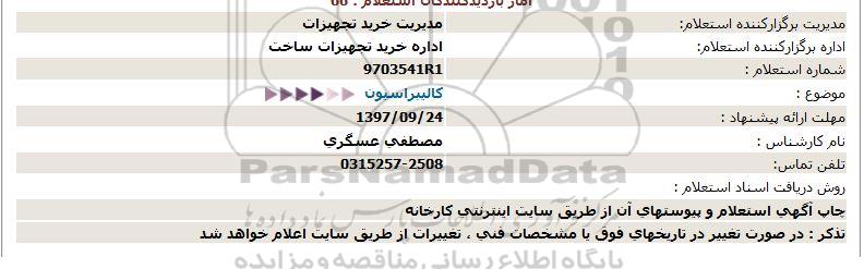 استعلام بها و موضوع استعلام استعلام, استعلام کالیبراسیون به اطلاع کلیه شرکت‌ها و افراد متخصص واجد شرایط می‌رساند، آگهی گذار در نظر دارد از طریق استعلام بها، نسبت به انتخاب و دریافت پیشنهادات اقدام نماید. این استعلام با کد آگهی ثبت شده در سامانه خبرگزاری پارس نماد : 1417521 منتشر شده است. مشخصات استعلام : تاریخ شروع استعلام: 1397/09/21 آخرین مهلت ارسال پیشنهاد قیمت : 1397/09/24 و محل اجرای پروژه : استان اصفهان میباشد. استعلام قیمت مورد درخواست : استعلام, استعلام کالیبراسیون با دسته‌بندی‌های تخصصی و گروه های مرتبط : ابزار دقیق, خدمات صنعتی, تجهیزات و ماشین آلات صنعتی, استعلام اطلاع رسانی میگردد.