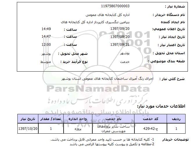 شرح کلی نیاز: اجرای رنگ آمیزی ساختمان کتابخانه های عمومی استان بوشهر
