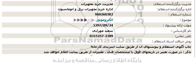 مناقصه الکتروموتور از کلیه افراد متخصص و شرکتها واجد شرایط دعوت به عمل میآید در مناقصه با کد خبرگزاری پارس نماد: 1418631 شرکت نمایند.