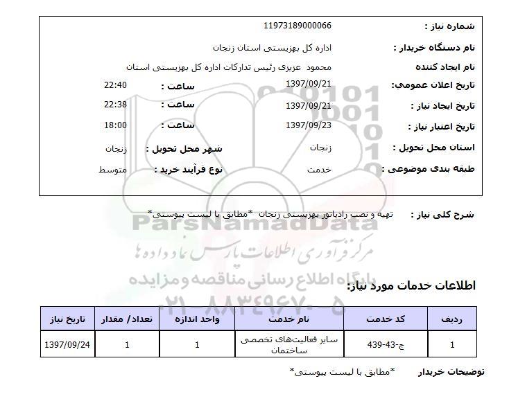 شرح کلی نیاز: تهیه و نصب رادیاتور بهزیستی زنجان * مطابق با لیست پیوستی