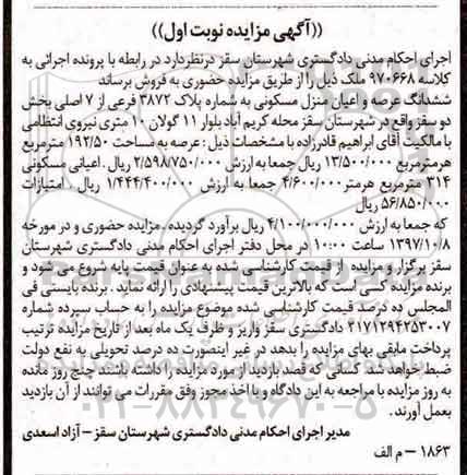 مزایده ششدانگ عرصه و اعیان منزل مسکونی 192.50 مترمربع نوبت اول کلاسه 970668