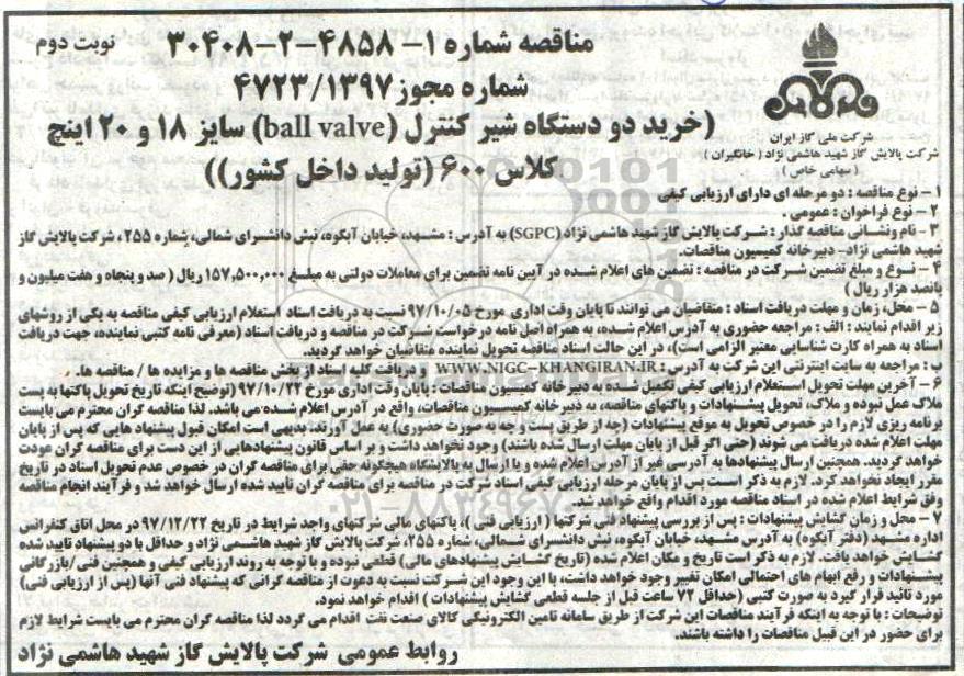 مناقصه خرید دو دستگاه شیر کنترل - نوبت دوم , مناقصه عمومی , مناقصه خرید دو دستگاه شیر کنترل - نوبت دوم
