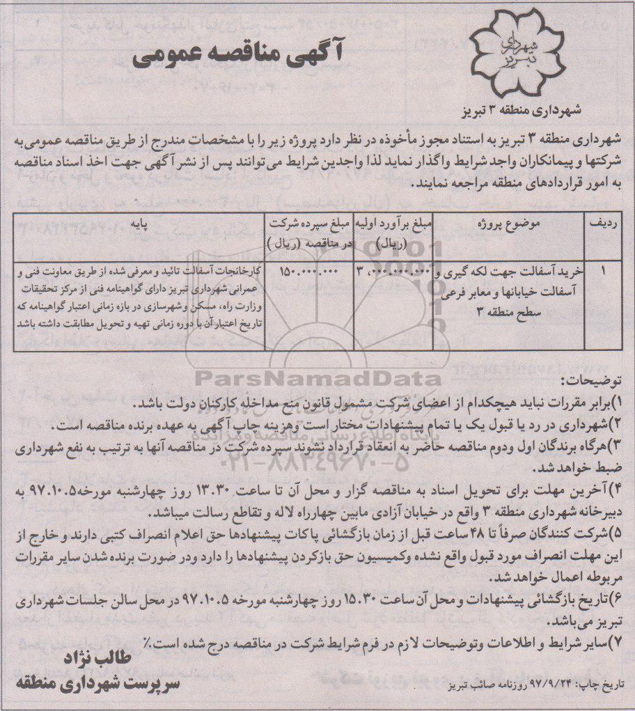 1. موضوع پروژه : خرید آسفالت جهت لکه گیری و آسفالت خیابان ها و معابر فرعی سطح منطقه 3
