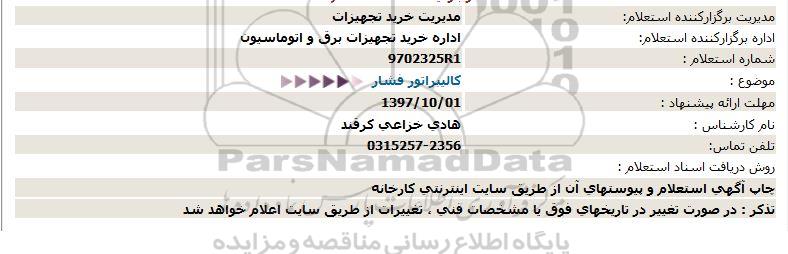 استعلام بها و موضوع استعلام استعلام, استعلام کالیبراتور فشار به اطلاع کلیه شرکتها و افراد متخصص واجد شرایط میرساند، آگهی گذار در نظر دارد از طریق استعلام بها، نسبت به انتخاب و دریافت پیشنهادات اقدام نماید. این استعلام با کد آگهی ثبت شده در سامانه خبرگزاری پارس نماد : 1420892 منتشر شده است. مشخصات استعلام : تاریخ شروع استعلام: 1397/09/24 آخرین مهلت ارسال پیشنهاد قیمت : 1397/10/01 و محل اجرای پروژه : استان اصفهان میباشد. استعلام قیمت مورد درخواست : استعلام, استعلام کالیبراتور فشار با دستهبندیهای تخصصی و گروه های مرتبط : ابزار دقیق, تجهیزات برق و الکترونیک, استعلام اطلاع رسانی میگردد.