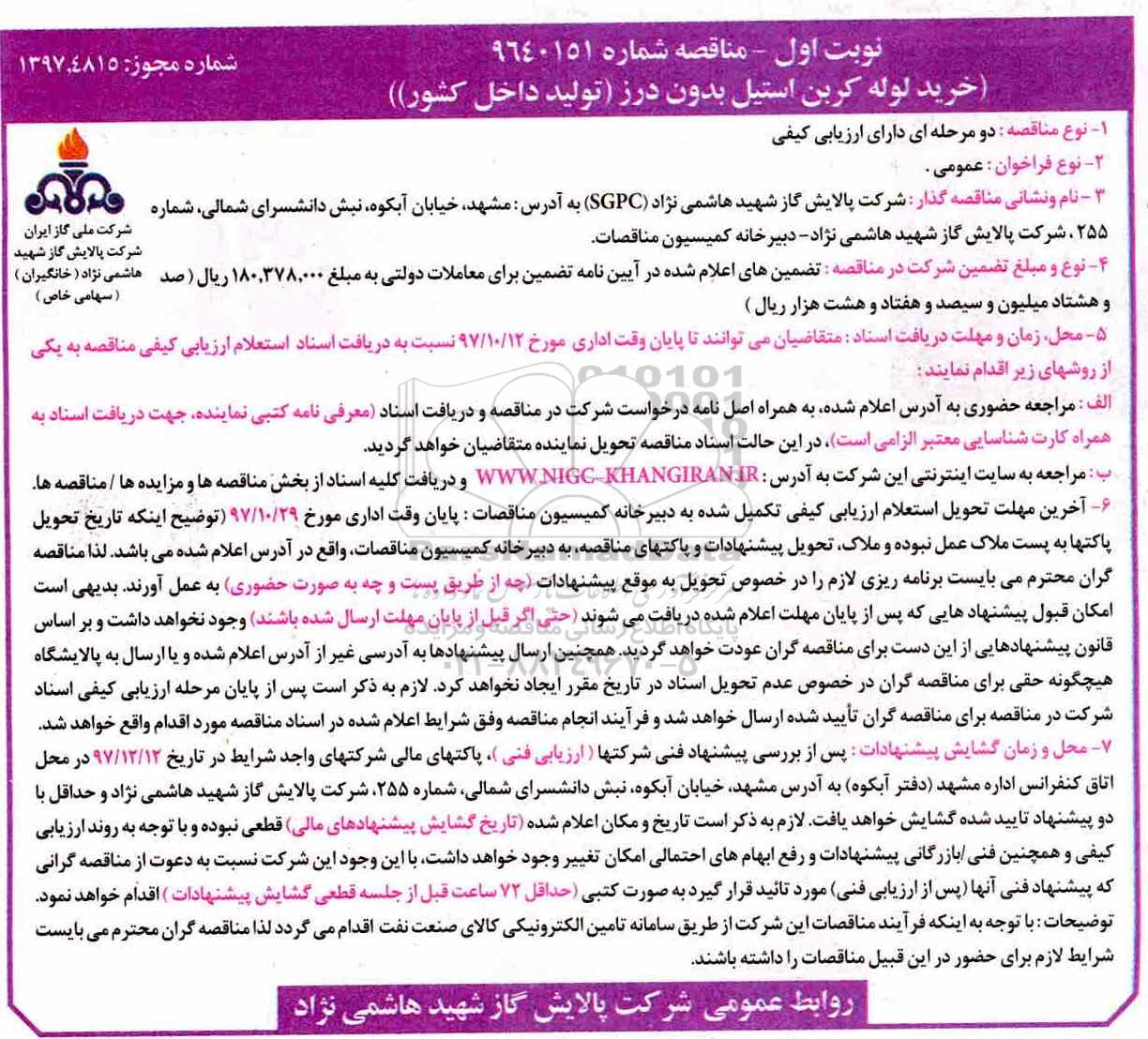 مناقصه خرید لوله کربن استیل بدون درز از کلیه افراد متخصص و شرکتها واجد شرایط دعوت به عمل میآید در مناقصه با کد خبرگزاری پارس نماد: 1421288 شرکت نمایند.