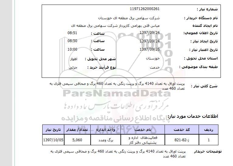 شرح کلی نیاز     پرینت اوراق به تعداد 4140 برگ و پرینت رنگی به تعداد 460 برگ و صحافی سیمی فلزی به تعداد 460 عدد