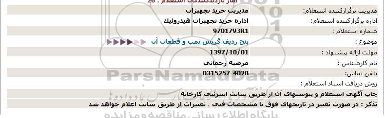 استعلام پنج ردیف گریس پمپ و قطعات آن , استعلام , استعلام پنج ردیف گریس پمپ و قطعات آن