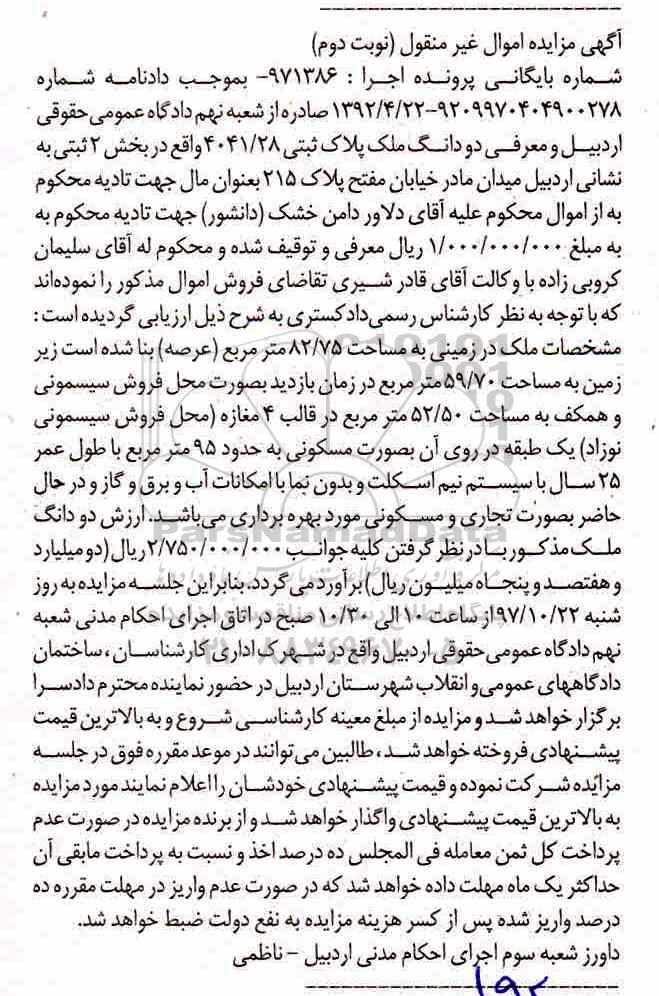 مزایده دو دانگ ملک پلاک ثبتی 4041.28 نوبت دوم پرونده 971386