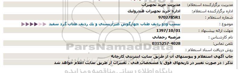 اداره برگزارکننده استعلام: اداره خرید تجهیزات هیدرولیک