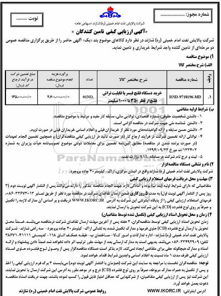 شرکت پالایش نفت امام خمینی ره شازند در نظر دارد کالاهای موضوع بند یک آگهی حاضر را از طریق برگزاری مناقصه عمومی دو مرحله ای از تامین کننده واجد شرایط خریداری و تامین نماید.