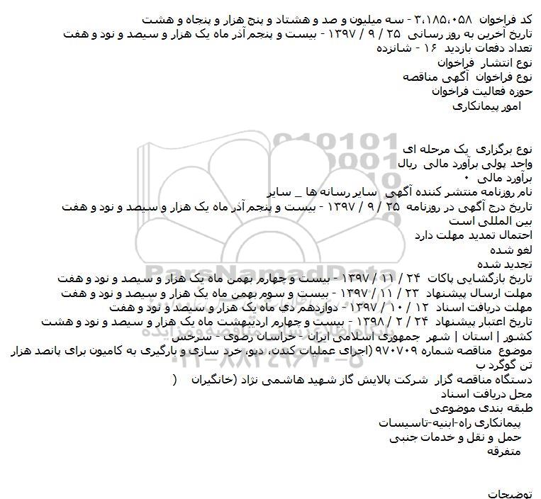 موضوع مناقصه شماره ٩٧٠٧٠٩ (اجرای عملیات كندن، دپو، خرد سازی و بارگیری به كامیون برای پانصد هزار تن گوگرد ب