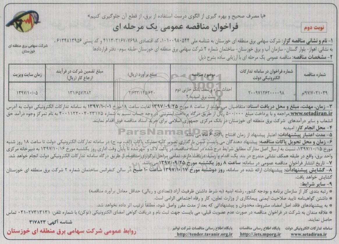 | 97/7021039/م | 2009712620000098 | احداث سازه و سقف بانک خازنی دوم در پست برق امیدیه 2 |