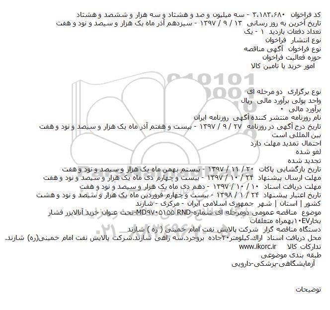 موضوع مناقصه عمومی دو مرحله ای شماره RND-۹۷۰۵۱۵۵-MDتحت عنوان خرید آنالایزر فشار بخارEV۱۰بهمراه متعلقات