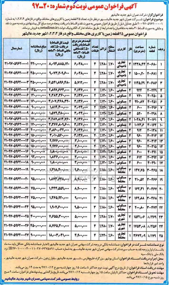 مزایده فروش 25 قطعه زمین با کاربری های مختلف نوبت دوم شماره 20-97