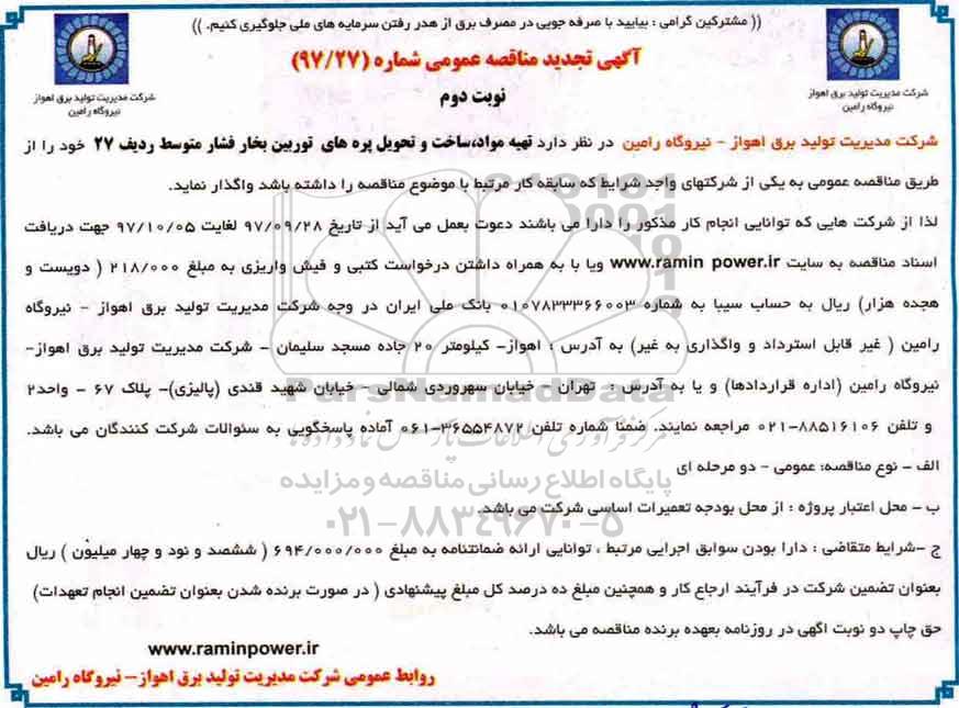 شرکت مدیریت تولید برق اهواز - نیروگاه رامین در نظر دارد تهیه مواد ، ساخت و تحویل پره های توربین بخار فشار متوسط ردیف 27 خود را از طریق مناقصه عمومی به یکی از شرکت های واجد شرایط که سابقه کار مرتبط با موضوع مناقصه را داشته باشد واگذارنماید