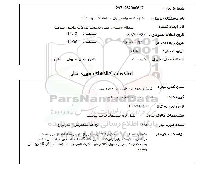 شرح کلی نیاز : شیشه دو جداره طبق شرح فرم پیوستی