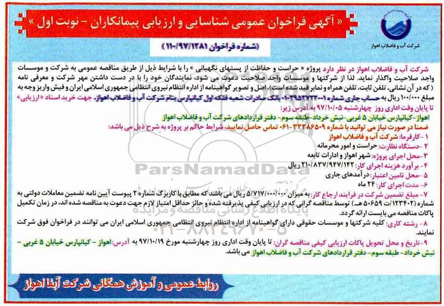 شرکت آب و فاضلاب اهواز در نظر دارد پروژه حراست و حفاظت از پستهای نگهبانی را با شرایط ذیل از طریق مناقصه عمومی به شرکت و موسسات واجد صلاحیت واگذار نماید.