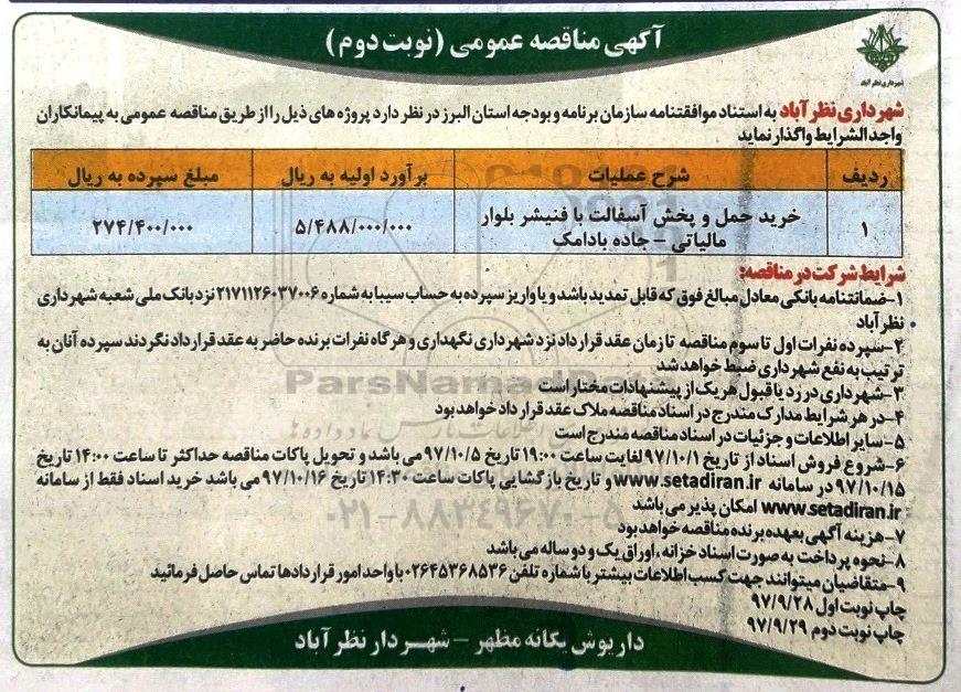 | 1 | خرید حمل و پخش آسفالت با فنیشر بلوار مالیاتی - جاده بادامک |