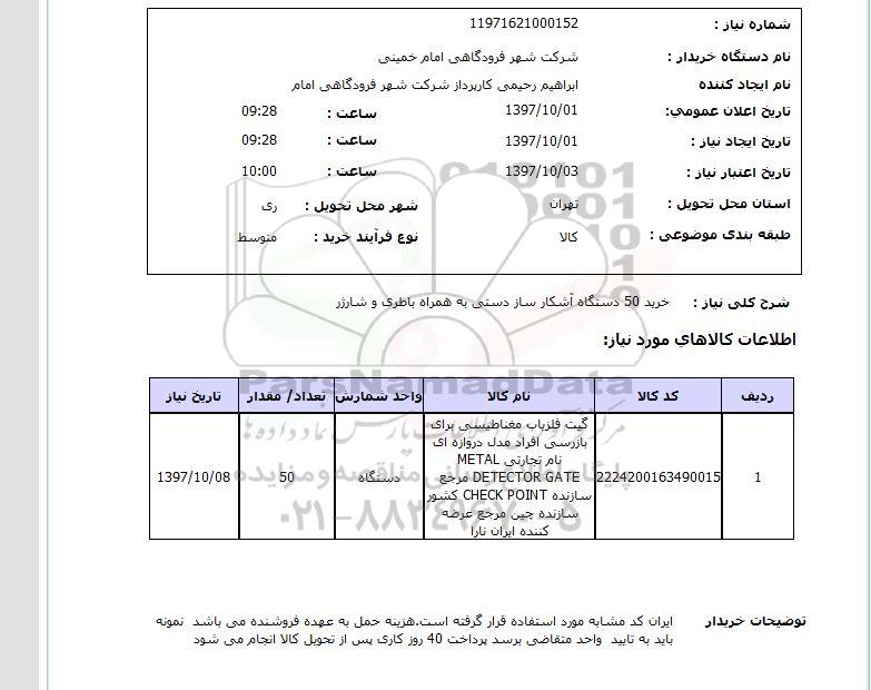 1 | 2224200163490015 | گیت آشکار ساز فلز مغناطیسی برای بازرسی افراد مدل دروازه ای نام تجارتی METAL DETECTOR GATE مرجع سازنده CHECK POINT کشور سازنده چین مرجع عرضه کننده ایران تارا | دستگاه | 50 | 97.10.08 |