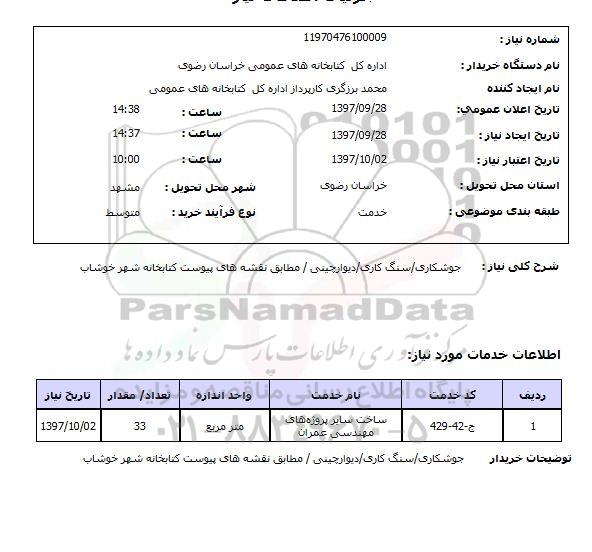 شرح کلی نیاز: جوشکاری ، سنگ کاری ، دیوارچینی مطابق نقشه های پیوست کتابخانه شهر خوشاب