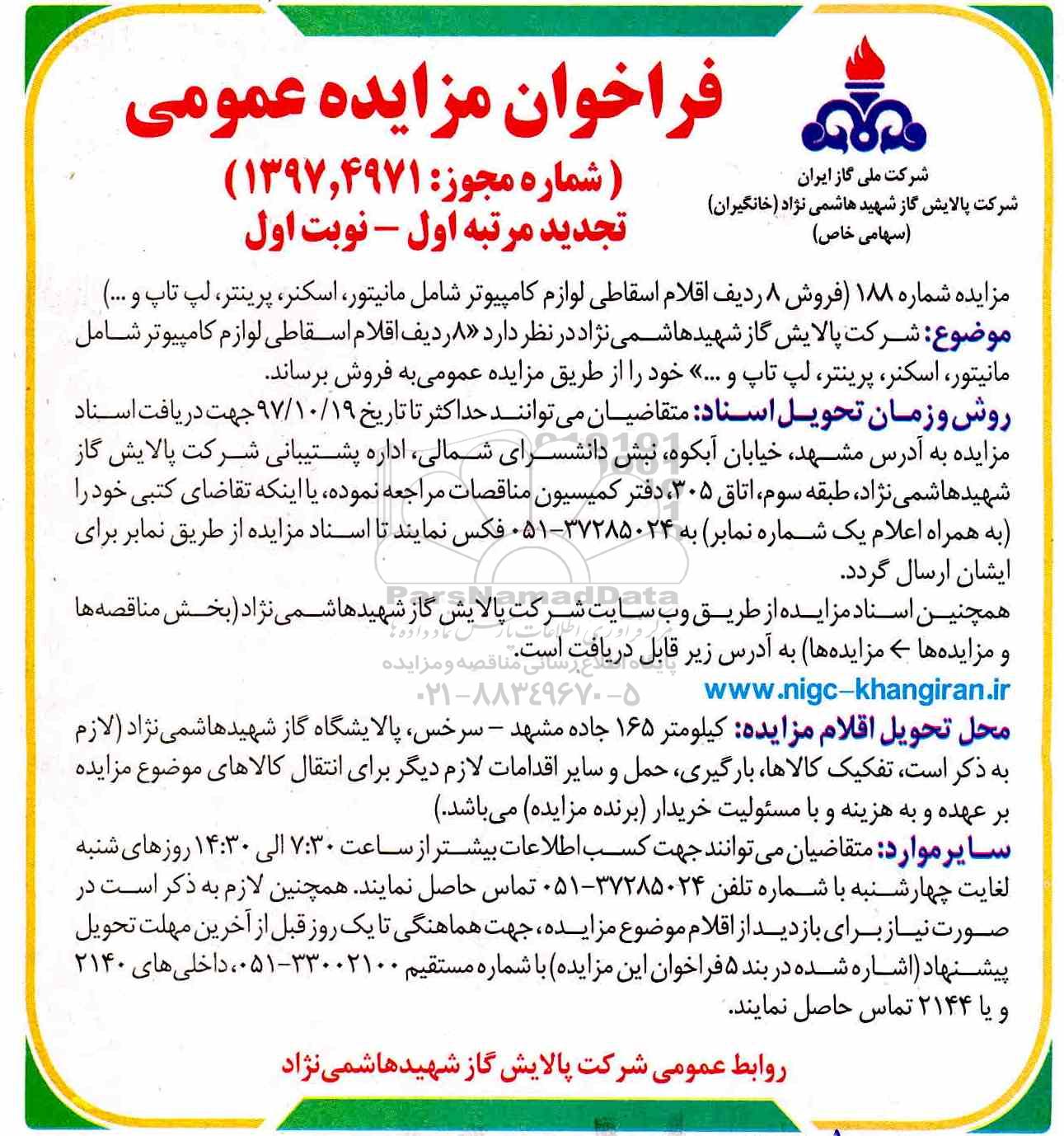 موضوع: شرکت پالایش گاز شهید هاشمی نژاد در نظردارد 8 ردیف اقلام اسقاطی لوازم کامپیوتر شامل مانیتور، اسکنر، پرینتر، لپ تاپ و...) خود را از طریق مزایده عمومی به فروش برساند.