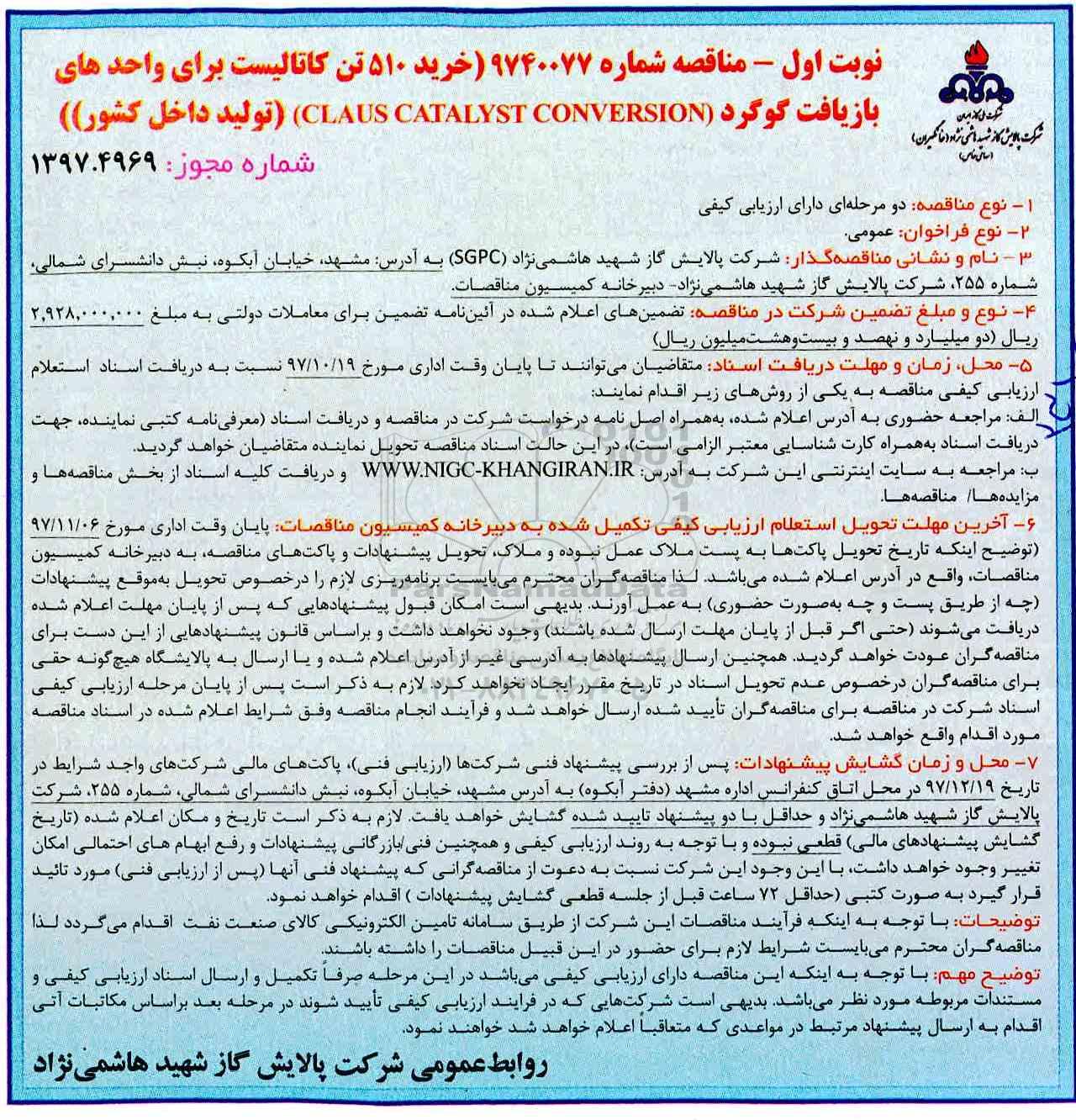 مناقصه خرید 510 تن کاتالیست برای واحدهای بازیافت گوگرد از کلیه افراد متخصص و شرکتها واجد شرایط دعوت به عمل میآید در مناقصه با کد خبرگزاری پارس نماد: 1432617 شرکت نمایند.